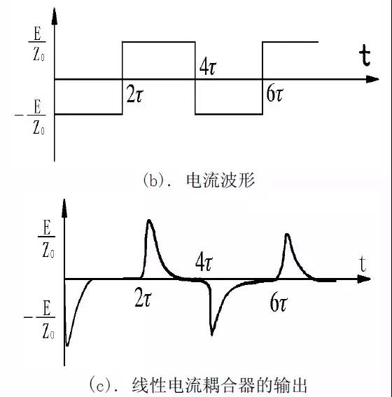 假設在t=0,電容上電壓為-E時,球間隙擊穿,產生沿電纜向前運動的電流波i0=-E/Z0,電流波在電纜遠端產生負的反射波ρi0=-i0,返回測量端,遠端反射電流波在測量端產生正的全反射,運動到遠端后,又被倒相反射回來??,電流波將如此來回反射,直到能量全部消耗掉。把測量端所有電流行波相加后,可得到如圖7.b所示的電流波形,圖7.c對應的是電流取樣耦合器輸出。可見,故障點未擊穿時,脈沖電流波形是交替變化極性的脈沖,相鄰脈沖之間的距離對應電纜長度。