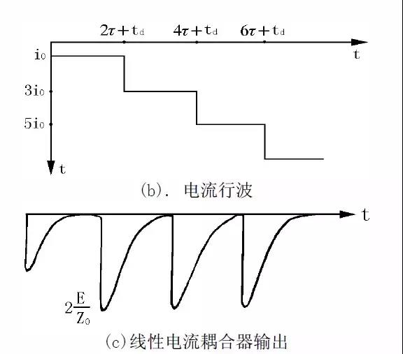 如圖9.a行波網格圖所示,球間隙擊穿后,高電壓波-E沿電纜向前運動,相應的電流波為i0=-E/Z0,經時間τ后,高電壓波到達故障點,故障點開始電離,在經放電延時td后,擊穿放電。電壓從-E突跳到0,產生如直閃法擊穿類似的行波過程,相應的電流波形與電流取樣耦合器的輸出分別見圖9.b與9.c 。