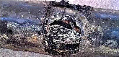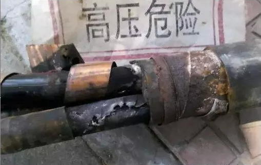 在加大放電間隙,提高放電電壓后,經過仔細定點,難以找到故障點精確位置,只能用特殊的方法,給故障點加壓,確定了故障點位置。開挖后,找到了接頭,但是,接頭外觀完好,加壓沖擊,接頭上并沒有明顯放電聲音,用定點儀探頭仔細判斷,確定接頭內部有故障。因為故障放電聲音不明顯,用戶研究請示后,才破開接頭,看到了故障點(接頭內部非常潮濕),接頭故障如圖5所示。