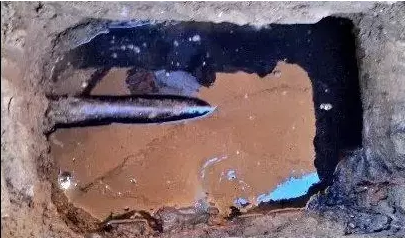 接頭故障排除后,檢測絕緣,死接地故障還存在,用閃測儀重新測試,波形基本與前面測試波形一樣,測試的故障距離為606米,還是用特殊的方法加壓沖擊,,用定點儀定點,在接頭位置前面10多米處,確定了故障點。因為排除了接頭故障點,這次精確定點,放電聲音明確,用戶開挖后,發現了故障點,并且,故障點完全開放泡在污水中,如圖6、圖7所示: